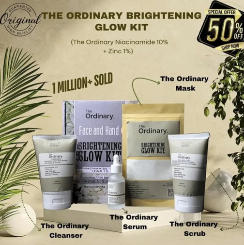 Glow every day with The Ordinary Glowing Kit! Enjoy a Face Scrub, Mask, Cleanser, and Serum for glowing skin.